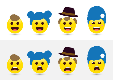 面白い表現するソーシャル メディアのスマイリー 髪と友達のうれしそうな 悲しいアイコン 明るい背景でかわいい笑顔の顔文字の家族のベクトル イラスト ボリューム黄色女性 男性 子供絵文字セットのイラスト素材 ベクタ Image